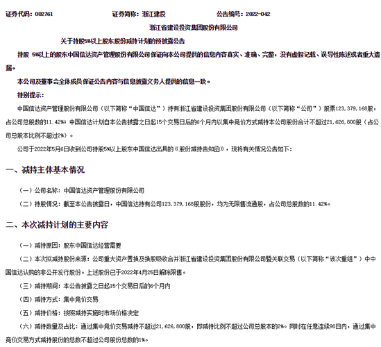 浙江建投今日另一個(gè)值的關(guān)注的公告是股東股份減持計(jì)劃。公司披露,持股5%以上股東中國信達(dá)擬減持不超2%公司股份。本次減持的股份,系公司重大資產(chǎn)置換及換股吸收合并浙江省建設(shè)投資集團(tuán)股份有限公司暨關(guān)聯(lián)交易中中國信達(dá)認(rèn)購的非公開發(fā)行股份。上述股份已于2022年4月25日解除限售。