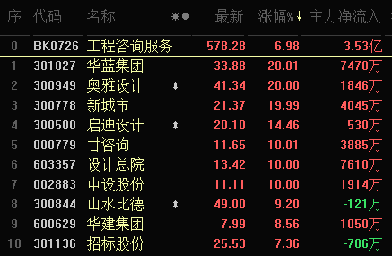 工程咨詢服務(wù)行業(yè)早盤受大盤低開影響略低開后迅速拉升,收?qǐng)?bào)578.28點(diǎn),漲幅6.98%,板塊中,有包括華藍(lán)集團(tuán)、奧雅設(shè)計(jì)、新城市在內(nèi)的6只個(gè)股漲停。