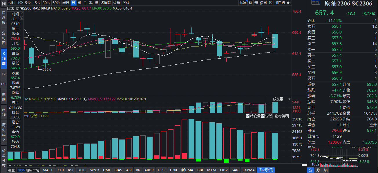 今日,國內(nèi)原油期貨大幅收跌。上期所原油期貨主力合約收盤于657.4元/桶,大幅下跌6.73%,為3月16日以來該合約最大單日跌幅。
