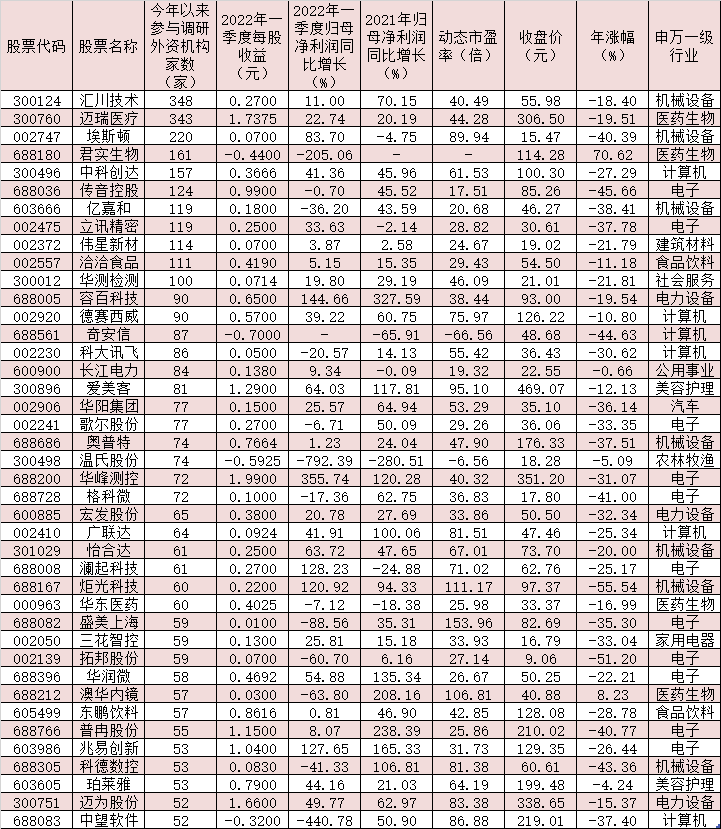 表:今年以來獲50家以上外資機(jī)構(gòu)密集調(diào)研的公司一覽