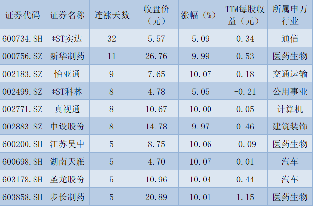 表:連續(xù)上漲且今日收盤漲停股前10位