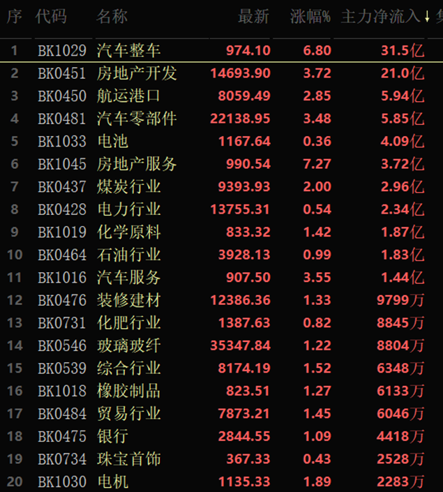 從資金流向看,汽車整車排名居首,大單資金凈流入達31.5億元,房地產開發(fā)以21億元居第二位。