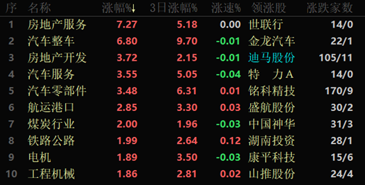 東方財富行業(yè)板塊看,有71類行業(yè)上漲,占同花順行業(yè)總數的82.56%,其中,房地產服務居首,漲7.27%,此外,汽車整車也超6%,達6.80%。
