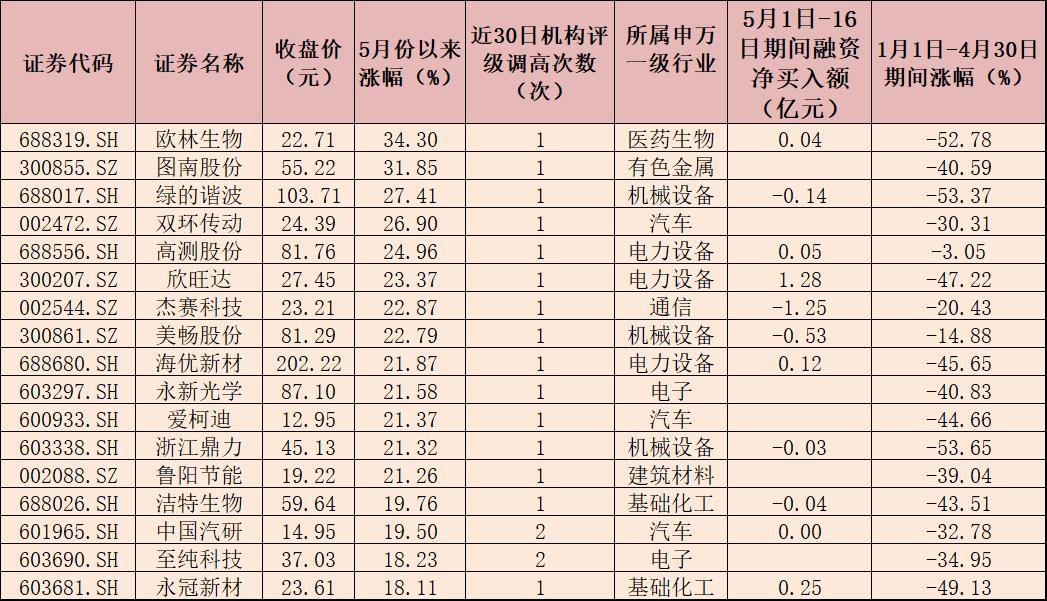 表:5月份以來(lái)漲幅超18%的機(jī)構(gòu)調(diào)高評(píng)級(jí)股一覽