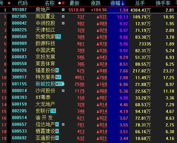 具體來看, 5月19日上午,房地產(chǎn)板塊異軍突起,表現(xiàn)出色,漲幅居首達1.94%,其中,南國置業(yè)、中洲控股、天津松江、我愛我家、數(shù)源科技、中國武夷等6只地產(chǎn)股漲停。