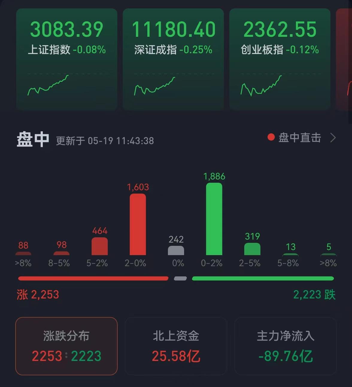 5月19日,三大股指低開后震蕩攀升。截至上午收盤,上證指數(shù)跌0.08%,報3083.39點;深證成指和創(chuàng)業(yè)板指跌幅分別為0.25%和0.12%;滬深兩市合計成交額4735.3億元;總體來看,兩市上漲個股達2253只,有2223只個股下跌。