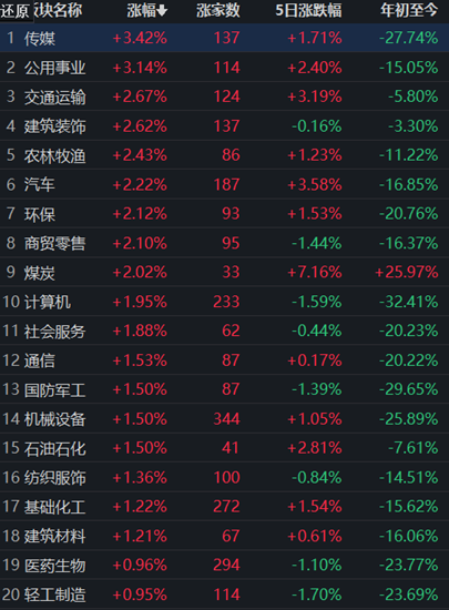 從申萬(wàn)一級(jí)行業(yè)看,傳媒行業(yè)指數(shù)收?qǐng)?bào)527.58點(diǎn),漲幅達(dá)3.42%,居申萬(wàn)行業(yè)首位。