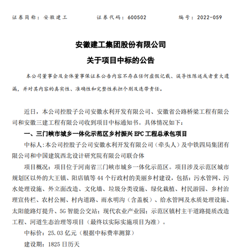 安徽建工公告,公司控股子公司安徽水利開(kāi)發(fā)有限公司(牽頭人)及中鐵四局集團(tuán)有限公司和中國(guó)建筑西北設(shè)計(jì)研究院有限公司聯(lián)合體中標(biāo)三門(mén)峽市城鄉(xiāng)一體化示范區(qū)鄉(xiāng)村振興EPC工程總承包項(xiàng)目,中標(biāo)價(jià)25.03億元;公司控股子公司安徽省公路橋梁工程有限公司中標(biāo)G36寧洛高速公路明光至蚌埠段改擴(kuò)建工程施工TJ-01標(biāo)段項(xiàng)目,中標(biāo)價(jià)6.69億元;公司控股子公司安徽三建工程有限公司中標(biāo)引江濟(jì)淮工程同大鎮(zhèn)二龍安置點(diǎn)(二期)及同大鎮(zhèn)集鎮(zhèn)安置點(diǎn)項(xiàng)目,中標(biāo)價(jià)10.90億元。合計(jì)中標(biāo)金額42.62億元。