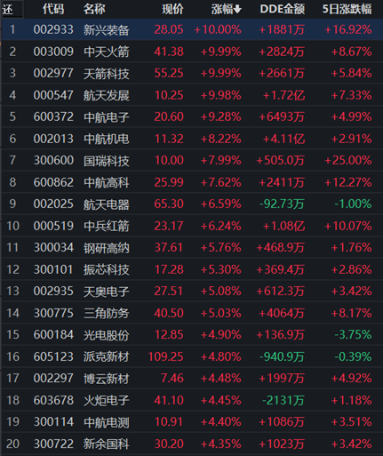 從個股來看,國防軍工行業(yè)98只交易的個股中,有90只上漲,其中,有4只個股漲停報收。