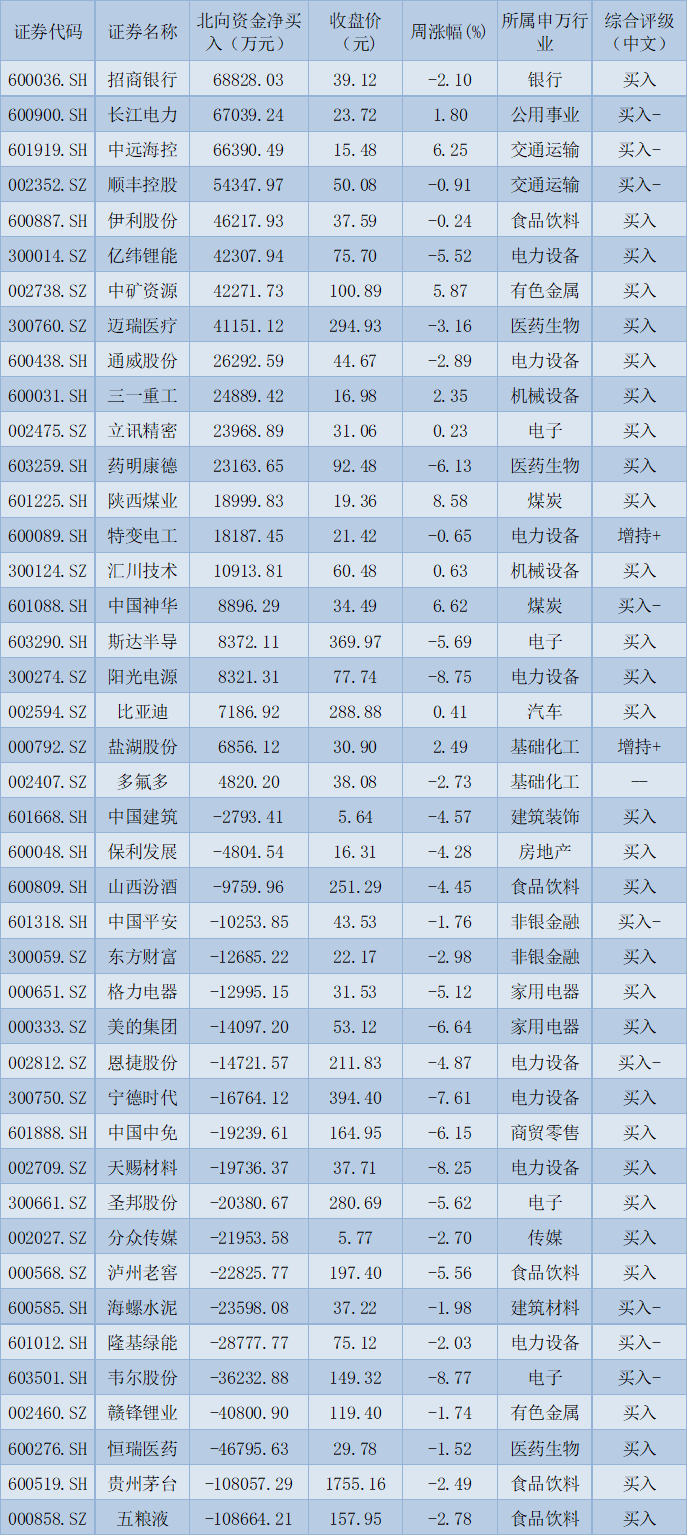 資金方面,北向資金本周累計(jì)凈買入金額達(dá)-95.80億元。從前十大成交活躍股來看,本周,招商銀行、長江電力、中遠(yuǎn)海控等3只個(gè)股北向資金凈買入金額均超6億元。另外,五糧液和貴州茅臺等個(gè)股遭北向資金凈賣出金額均超10億元。
