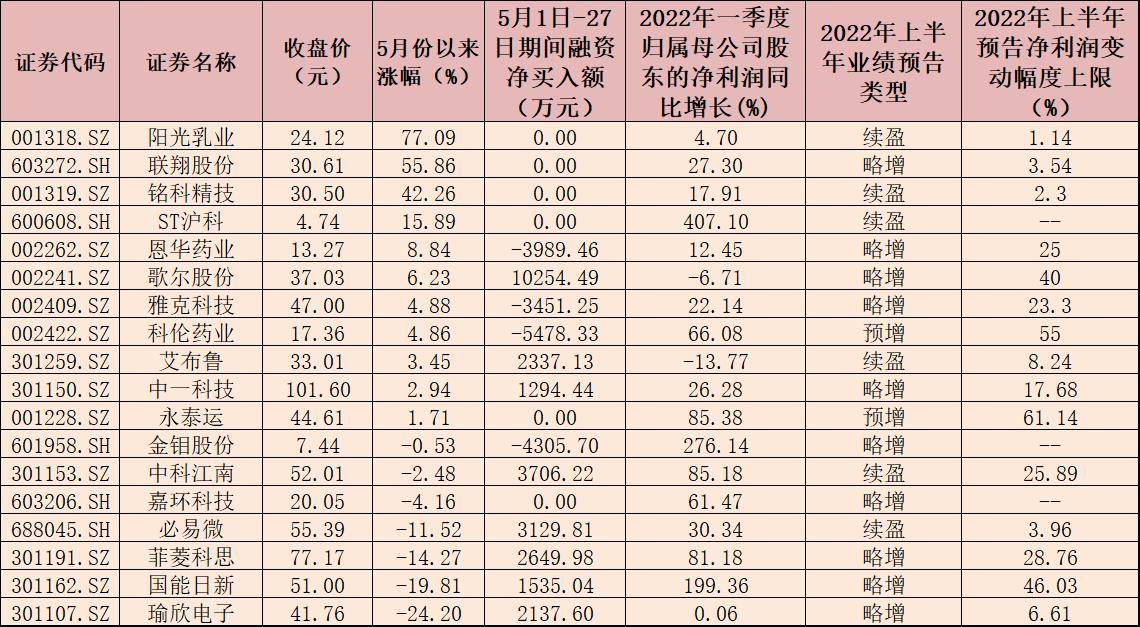 良好的業(yè)績預(yù)期對(duì)于股價(jià)也提供了一定支撐。5月份以來,上述18只個(gè)股中有11只個(gè)股期間實(shí)現(xiàn)上漲,其中,陽光乳業(yè)(77.09%)、聯(lián)翔股份(55.86%)、銘科精技(42.26%)、ST滬科(15.89%)等個(gè)股期間累計(jì)漲幅均超15%。