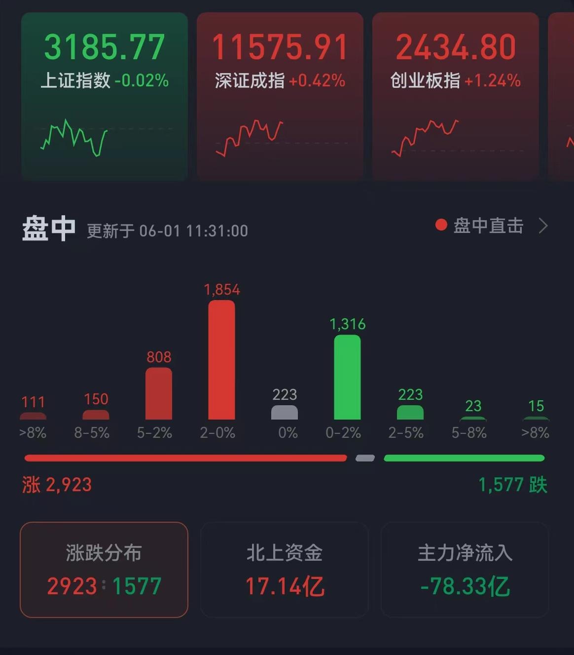 6月1日,三大股指震蕩攀升,漲跌不一。截至上午收盤,上證指數(shù)微跌0.02%,報(bào)3185.77點(diǎn);深證成指和創(chuàng)業(yè)板指漲幅分別為0.42%和1.24%;滬深兩市合計(jì)成交額5435.6億元;總體來看,兩市個(gè)股漲多跌少。