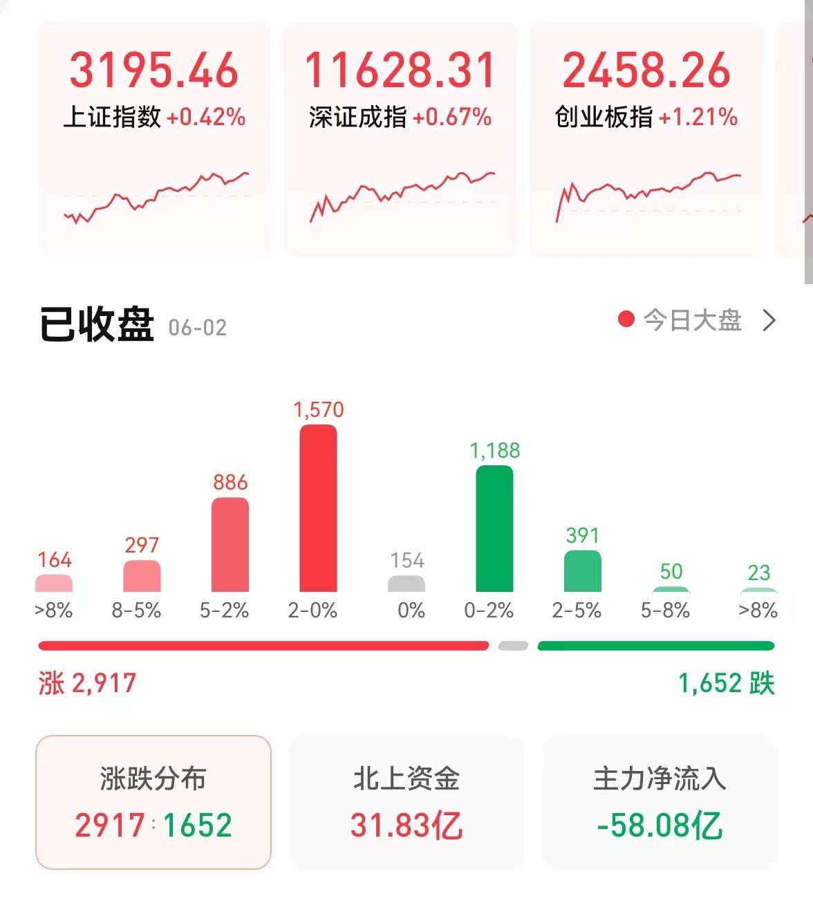 6月2日,三大股指集體收漲,截至收盤(pán),上證指數(shù)漲0.42%報(bào)3195.46點(diǎn),深證成指漲0.67%報(bào)11628.31點(diǎn),創(chuàng)業(yè)板指漲1.21%報(bào)2458.26點(diǎn);兩市合計(jì)成交8917億元,北向資金凈買入31.83億元??傮w來(lái)看,兩市個(gè)股漲多跌少。