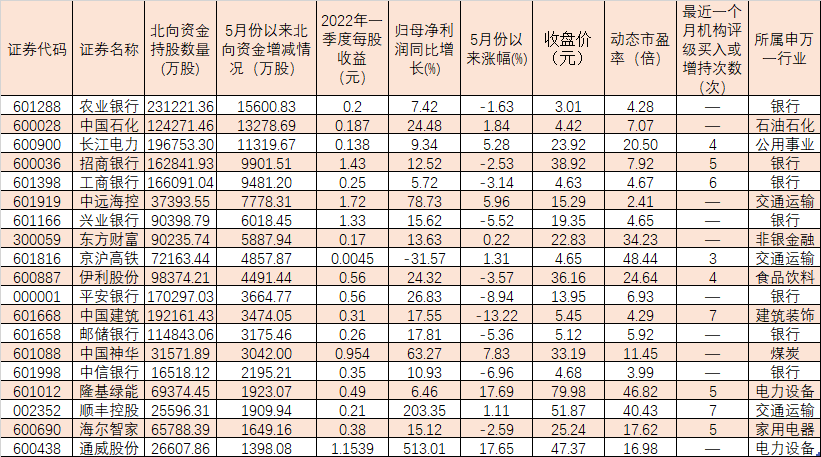 表:5月份以來受到千萬股以上北向資金加倉的富時中國A50指數(shù)成份股