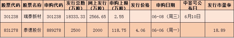 根據(jù)新股發(fā)行安排,下周(6月6日-10日)僅有2只新股申購。其中,北交所新股泰德股份是國內(nèi)汽車空調(diào)器軸承龍頭,創(chuàng)業(yè)板新股瑞泰新材是國內(nèi)鋰離子電解液龍頭供應(yīng)商。