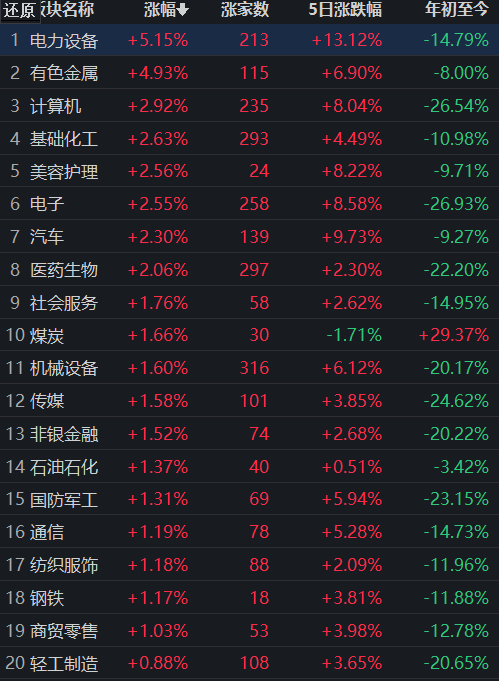 申萬行業(yè)方面,截至6月6日11:30,31類行業(yè)中有25類上漲,占比80.65%。電力設備行業(yè)居漲幅榜首,漲幅達5.15%,此外,有色金屬行業(yè)漲幅也超過4%;跌幅居首的行業(yè)是房地產,下跌1.43%。