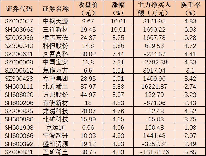 表:6月6日上午稀土永磁板塊漲幅超4%的個(gè)股一覽