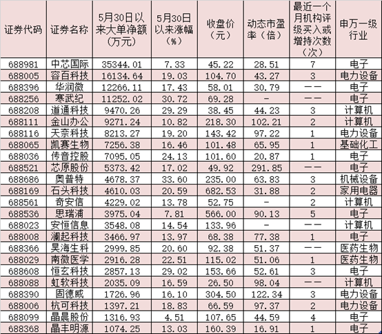 表:5月30日以來大單資金凈買入超千萬元的科創(chuàng)50指數(shù)成份股
