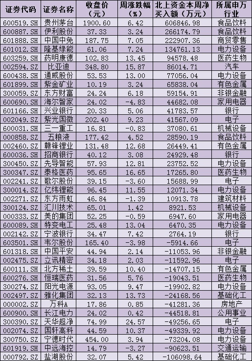 資金方面,北向資金本周累計(jì)凈買(mǎi)入金額達(dá)368.3億元,創(chuàng)年內(nèi)新高。從前十大成交活躍股來(lái)看,本周,貴州茅臺(tái)、伊利股份、中國(guó)中免、隆基綠能等4只個(gè)股,北向資金凈買(mǎi)入金額均超10億元。另外,鹽湖股份、中遠(yuǎn)???、寧德時(shí)代等個(gè)股遭北向資金凈賣(mài)出金額均超5億元。