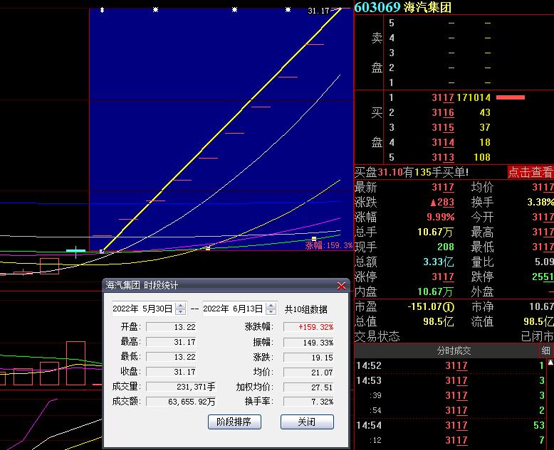 6月13日,熱門股海汽集團(tuán)再度漲停,截至收盤,報(bào)31.17元,總市值達(dá)98.5億元,走出了10連板,期間累計(jì)漲達(dá)159.32%。