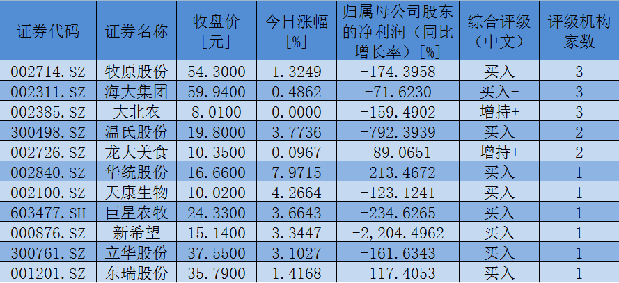特別值得一提的是,最近30日內(nèi),牧原股份、海大集團(tuán)、大北農(nóng)、溫氏股份、龍大美食、華統(tǒng)股份、天康生物、巨星農(nóng)牧、新希望、立華股份、東瑞股份等11只豬肉概念股獲機(jī)構(gòu)給予“買入”或“增持”等看好評級。