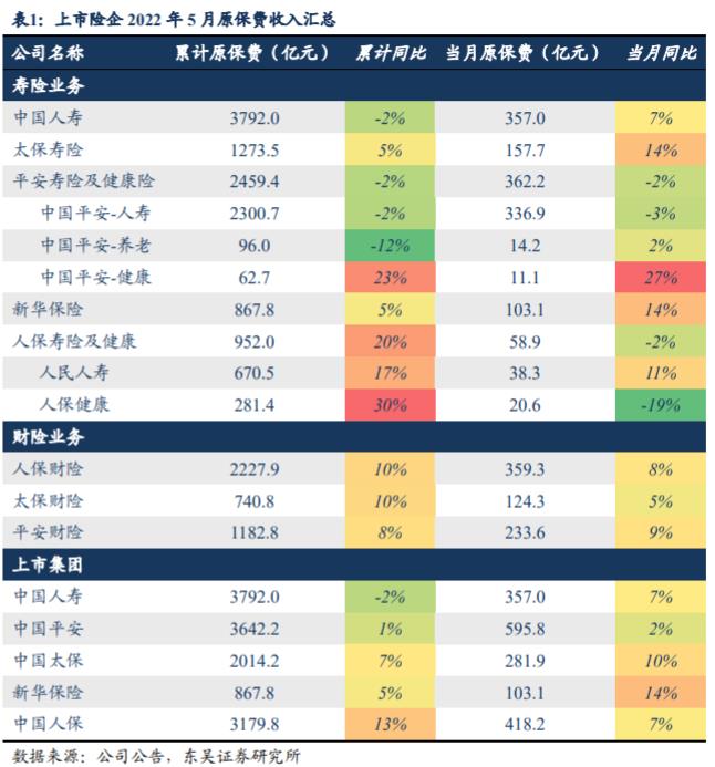 分業(yè)務(wù)來看,目前壽險(xiǎn)業(yè)對上市險(xiǎn)企的影響最大。5月份上市險(xiǎn)企壽險(xiǎn)保費(fèi)加速回暖。其中,新華保險(xiǎn)前5個(gè)月保費(fèi)收入同比增長4.97%,增速較前4個(gè)月上漲1.17個(gè)百分點(diǎn);中國人壽前5個(gè)月保費(fèi)同比降幅較前4個(gè)月進(jìn)一步收窄。
