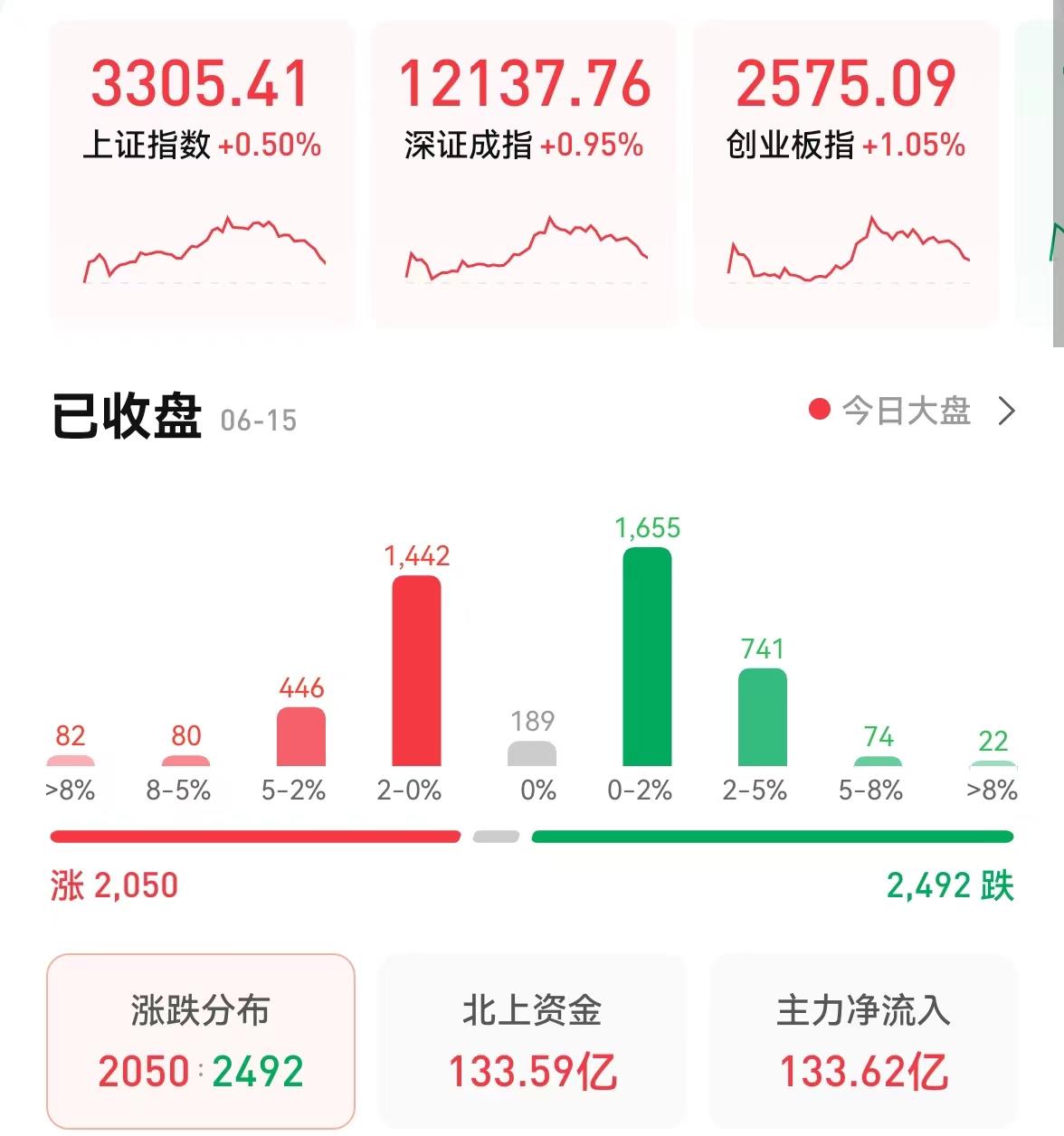 6月15日,三大股指集體收漲,截至收盤(pán),上證指數(shù)0.5%報(bào)3305.41點(diǎn),深成指漲0.95%報(bào)12137.76點(diǎn),創(chuàng)業(yè)板指漲1.05%報(bào)2575.09點(diǎn),上證50指數(shù)漲1.43%;兩市合計(jì)成交12990億元,已連續(xù)4個(gè)交易日突破萬(wàn)億元。北向資金凈買(mǎi)入金額達(dá)133.59億元。總體來(lái)看,兩市個(gè)股跌多漲少。