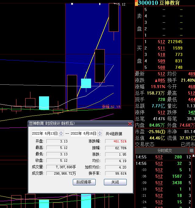 6月16日,熱門(mén)股豆神教育再度漲停,截至收盤(pán),報(bào)5.12元,近4個(gè)交易日已斬獲3個(gè)“20cm”漲停,期間累計(jì)漲達(dá)61.51%。