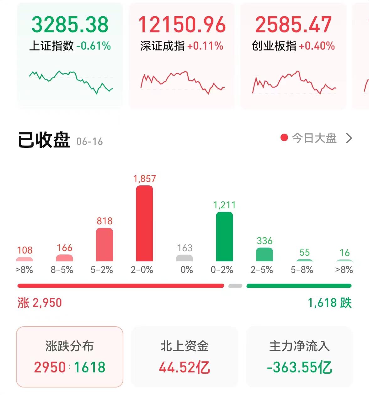 6月16日,三大指數(shù)漲跌不一,截至收盤(pán),上證指數(shù)跌0.61%報(bào)3285.38點(diǎn),深證成指漲0.11%報(bào)12150.96點(diǎn),創(chuàng)業(yè)板指漲0.4%報(bào)2585.47點(diǎn);兩市合計(jì)成交10808億元,北向資金凈買(mǎi)入44.52億元??傮w來(lái)看,兩市個(gè)股漲多跌少。
