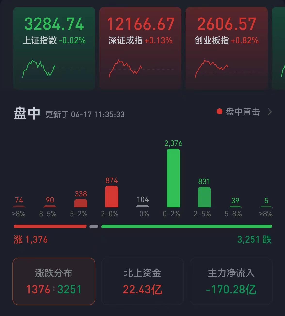 周四(6月16日)美股大幅收跌,道指跌2.42%,下破30000點(diǎn)關(guān)口,納指重挫4.08%,標(biāo)普跌3.25%。6月17日,A股市場(chǎng)繼續(xù)走出獨(dú)立行情。三大股指震蕩分化。截至上午收盤(pán),上證指數(shù)微跌0.02%,報(bào)3284.74點(diǎn);深證成指和創(chuàng)業(yè)板指漲幅分別為0.13%和0.82%;滬深兩市合計(jì)成交額6572.8億元;總體來(lái)看,兩市個(gè)股跌多漲少。