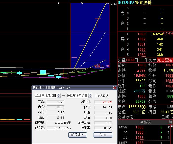 6月17日,集泰股份再度漲停,截至收盤,報10.63元,總市值達(dá)39.62億元,連續(xù)6個交易日漲停,期間累計漲幅達(dá)77.46%。