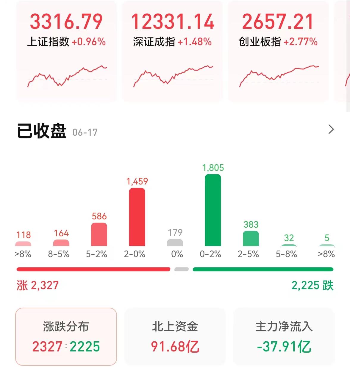 6月17日,三大股指低開高走,集體收漲,截至收盤,上證指數(shù)漲0.96%報3316.79點(diǎn),深證成指漲1.48%報12331.14點(diǎn),創(chuàng)業(yè)板指漲2.77%報2657.21點(diǎn);兩市合計成交10934億元,連續(xù)第6個交易日突破萬億元;北向資金凈買入91.68億元??傮w來看,A股個股漲多跌少。其中,有76只個股漲停。