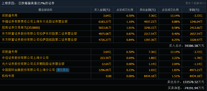 盤后龍虎榜數(shù)據(jù)顯示,深股通賣出7.36億元并買入3.64億元,中信證券上海分公司賣出1.8億元,一機構(gòu)專用席位凈賣出8434萬元。
