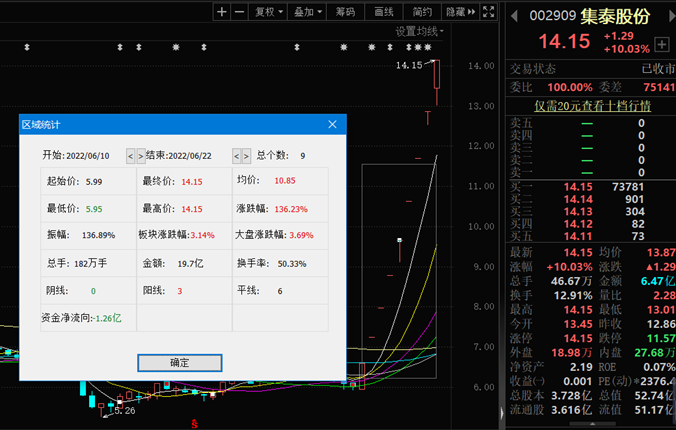 6月22日,集泰股份再度漲停,報14.15元,這是該股收獲的第9個漲停板,自6月10日以來,截至6月22日,該股累計漲幅已達136.23%。