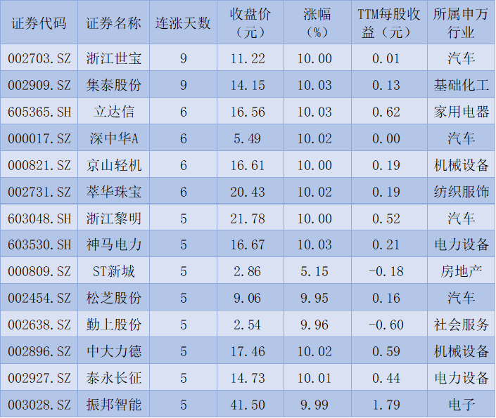 表:連續(xù)上漲5天且今日收盤漲停股一覽