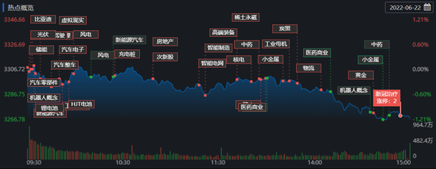 6月22日,A股三大股指回落,截至收盤,上證指數(shù)跌1.20%報3267.20點,深證成指跌1.43%報12246.55點,創(chuàng)業(yè)板指跌0.58%報2677.29點;兩市合計成交額達9964.54億元,北向資金凈賣出68.20億元??傮w來看,兩市個股漲少跌多,上漲個股有948只。
