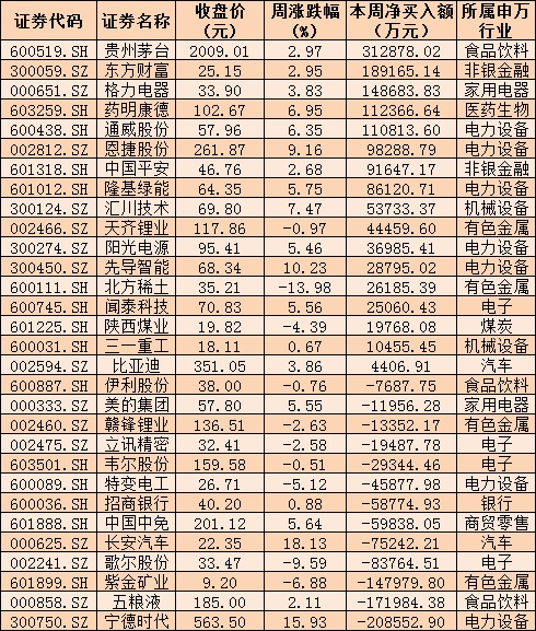 資金方面,北向資金本周累計凈買入金額達40.64億元,本月累計凈買入額達627.29億元。從前十大成交活躍股來看,本周,貴州茅臺、東方財富、格力電器、藥明康德、通威股份等5只個股,獲北向資金凈買入金額均超10億元。另外,寧德時代、五糧液、紫金礦業(yè)等個股遭北向資金凈賣出金額均超10億元。
