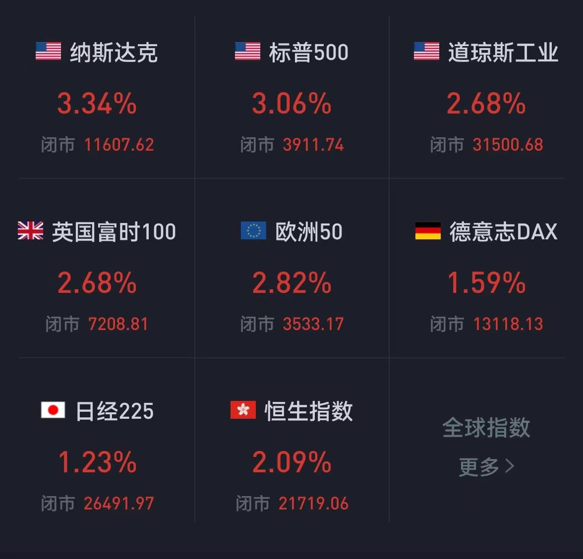 周五,美國三大股指全線收漲,道指漲2.68%報31500.68點,標普500指數(shù)漲3.06%報3911.74點,納指漲3.34%報11607.62點。本周,道指漲5.39%,標普500指數(shù)漲6.45%,納指漲7.49%。