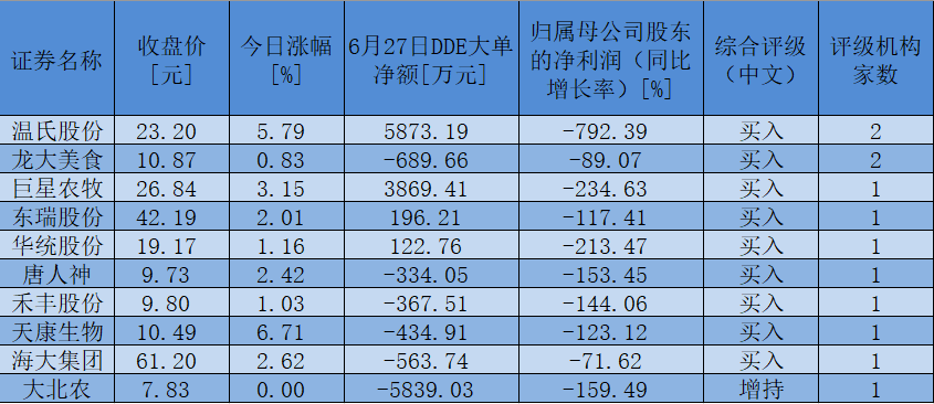 表:截至6月27日,最近30日內(nèi),獲機(jī)構(gòu)看好評級的豬肉股一覽