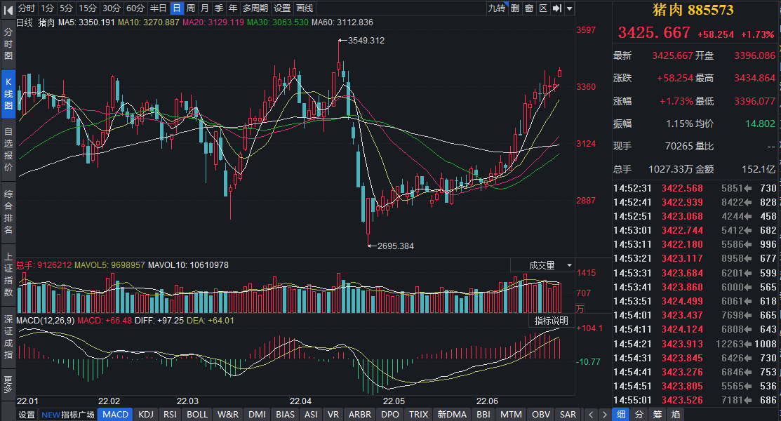 “生豬5月份以來出欄量持續(xù)下降,疊加即將進(jìn)入豬肉消費(fèi)旺季,在題材、資金等多重因素作用下今日生豬期貨價(jià)格大幅上漲。”東吳期貨農(nóng)產(chǎn)品研究員郭大順對《證券日報(bào)》記者說。