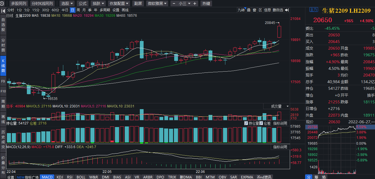 同花順數(shù)據(jù)顯示,6月27日,大商所9月份交貨的生豬期貨主力合約上漲4.90%,創(chuàng)4月19日以來該期貨合約最大單日漲幅,收盤價(jià)為20650元/噸,在各農(nóng)產(chǎn)品期貨中漲幅位居前列。且6月份以來,該期貨合約已上漲8.23%。