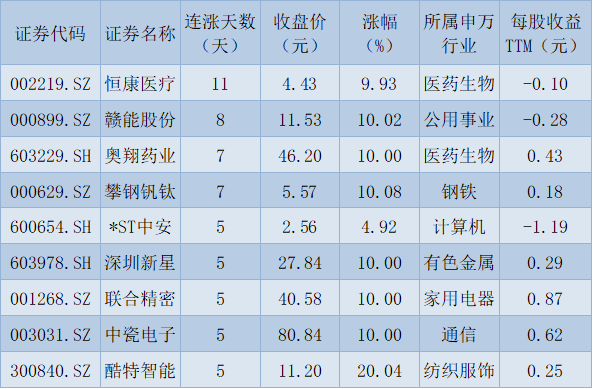 表:連續(xù)上漲5天且今日收盤漲停股一覽