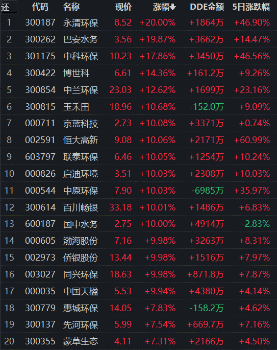從領漲的環(huán)保行業(yè)看,截至7月18日11:30,行業(yè)交易中的131只個股,有129只上漲,其中,有13只個股漲停,有49只個股漲幅超5%。從資金流向看,環(huán)保行業(yè)今天上午大單資金凈流入額達3.95億元,居各行業(yè)第10位。