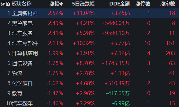 同花順行業(yè)方面,截至7月19日11:30,76類行業(yè)中有50類上漲,占比65.79%。金屬新材料行業(yè)居漲幅榜首,漲幅達2.52%,此外,包括黑色家電和汽車服務等在內(nèi)的3類行業(yè)漲幅也均超2%;下跌超1%的行業(yè)分別為養(yǎng)殖業(yè)和電力,分別下跌1.11%和1.07%。