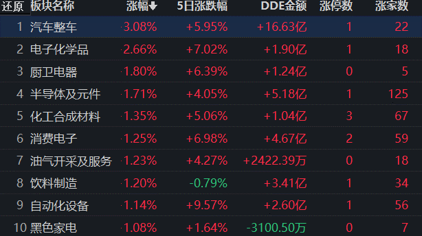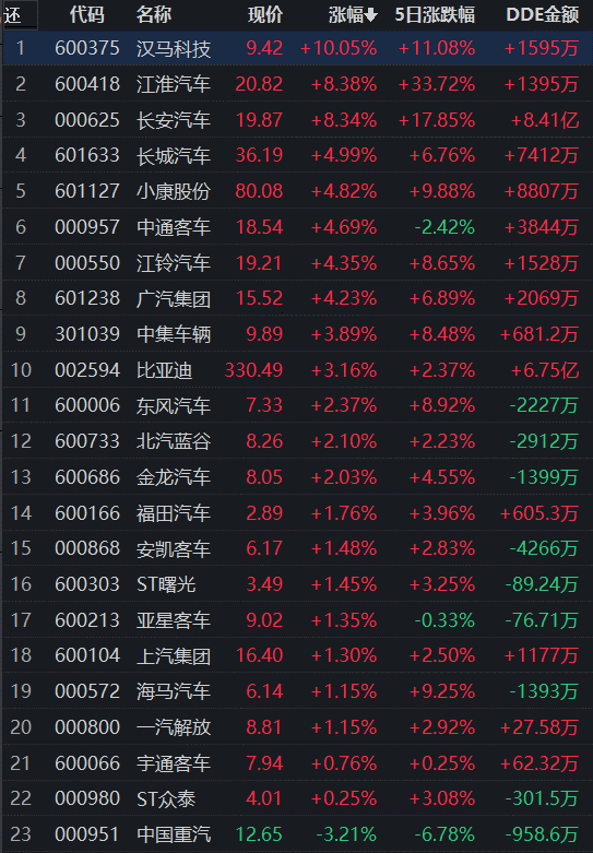 從漲幅居首的汽車(chē)整車(chē)行業(yè)看,截至8月1日11:30,行業(yè)交易中的23只個(gè)股,有22只上漲,其中,有1只個(gè)股漲停,有8只個(gè)股漲幅超4%。從資金流向看,汽車(chē)整車(chē)行業(yè)今天上午大單資金凈流入額達(dá)16.63億元,居各行業(yè)第1位。