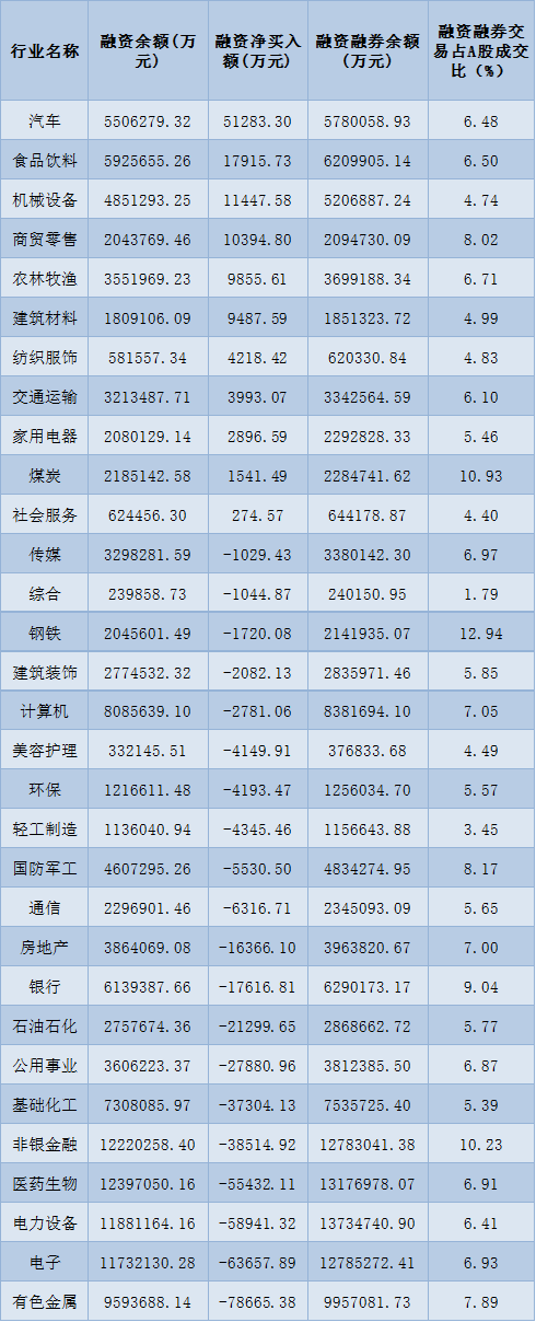表:7月29日申萬(wàn)一級(jí)行業(yè)兩融交易情況:
