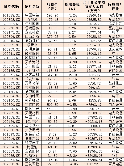 資金方面,北向資金本周累計(jì)凈賣(mài)出金額達(dá)12.33億元。從前十大成交活躍股來(lái)看,中國(guó)中免、五糧液、伊利股份、恒瑞醫(yī)藥、立訊精密等個(gè)股,北向資金凈買(mǎi)入金額均超3億元。另外,三花智控、陽(yáng)光電源、招商銀行、寶鋼股份、比亞迪等個(gè)股遭北向資金凈賣(mài)出金額均超4億元。