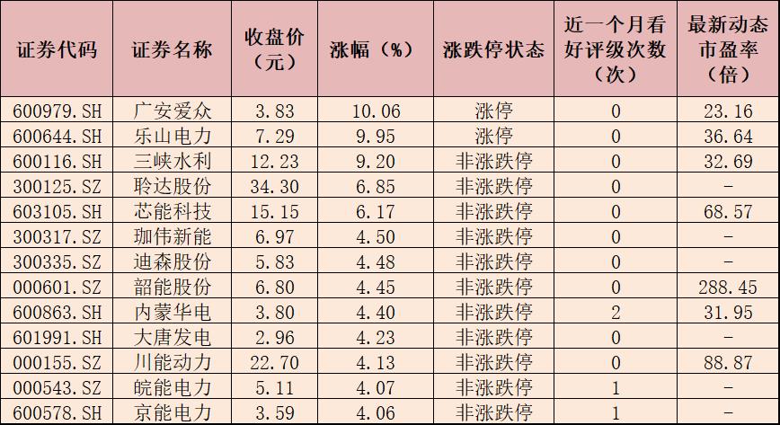 表:8月15日漲幅超4%的電力股一覽