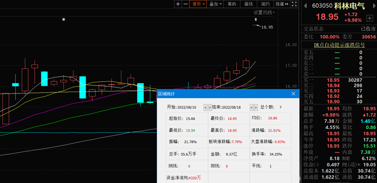 8月18日,科林電氣漲9.98%,報(bào)18.95元。該股自8月10日以來(lái),截至8月18日已連續(xù)7個(gè)交易日上漲,累計(jì)漲幅達(dá)16.86%。最新該股A股總市值達(dá)30.74億元,A股流通市值30.74億元。