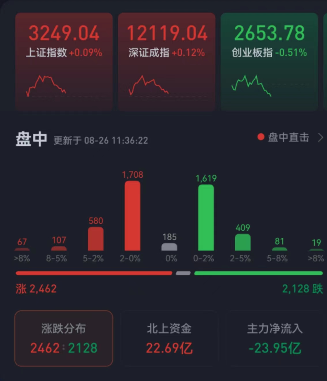 周五(8月26日),三大股指震蕩分化,漲跌不一。截至上午收盤,上證指數漲幅為0.09%,報3249.04點;深證成指漲幅為0.12%,創(chuàng)業(yè)板指微跌0.51%;滬深兩市合計成交額5889.2億元,總體來看,兩市個股漲多跌少。